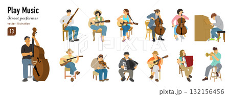 いろんな楽器を演奏する人たちの手描きカラーイラストセット