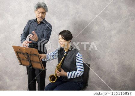 サックスを吹くブラスバンド部員と顧問の女性教師