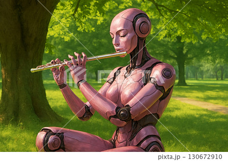 木陰でフルートを演奏しているロボット