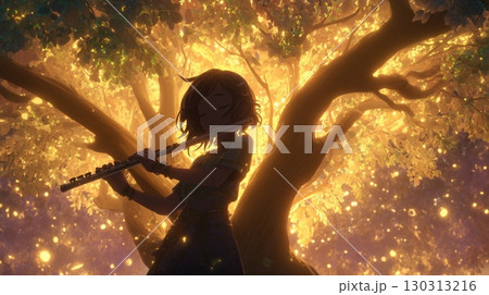 光の樹の下でフルートを奏でる少女