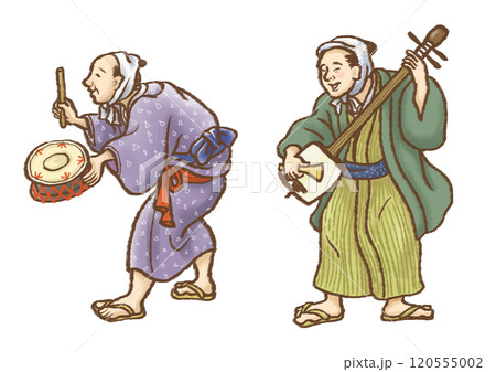 江戸時代の着物を着た男性が三味線や太鼓を演奏する