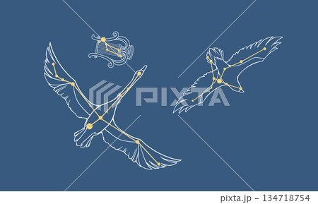 夏の大三角の線画イラスト(ゴールド色で線のみ、白鳥・鷲・琴の絵あり)