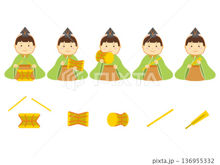 和紙ちぎり絵の五人囃子セット 白背景素材