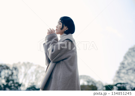 少女漫画風立ちポーズのコートを着た女性イラスト