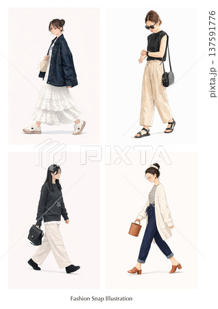 シンプルかわいい手書きの秋コーデ女子たちのイラスト素材