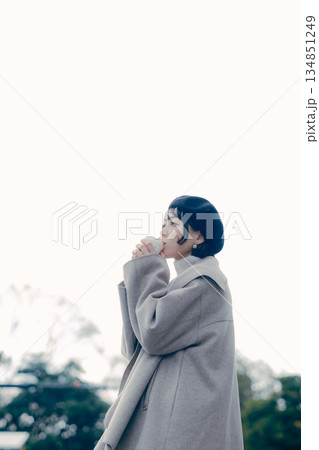 屋外でコーヒーを飲む30代女性のライフスタイルポートレート