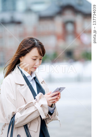 駅のホームでコーヒーを飲む30代女性のライフスタイルシーン