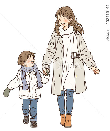 冬服 男の子 ニット帽 ダウンコート ブーツ 手袋 笑顔 イラスト 手描き