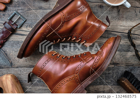 木製テーブルの上のウィングチップブーツとアクセサリー