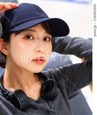 キャップとヘッドホン姿の女性 ■撮影協力:関西国際空港(KIX)