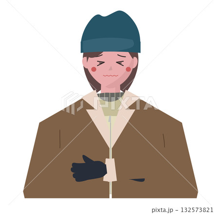 寒がる女性。冬の寒さに凍える人物。寒くて震える。コート、手袋、ニット帽。ベクターイラスト