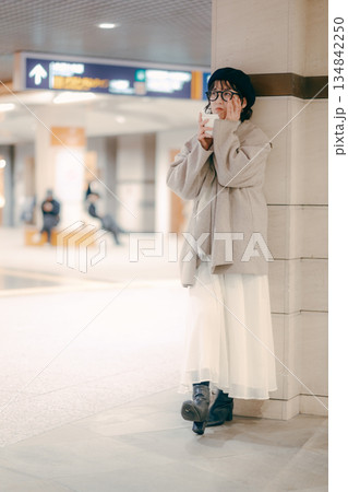 待ち合わせ中にコーヒーを飲む30代女性の全身ポートレート