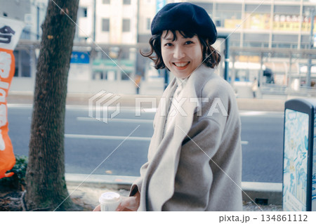 バス停でコーヒーを飲みながら待つ30代女性のポートレート