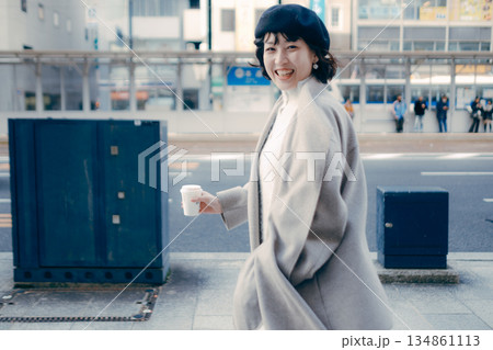 観光地でコーヒーカップを持ち笑顔で歩く30代女性