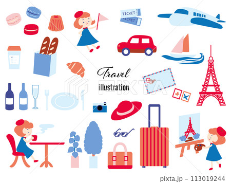 フランス旅行にまつわるベクターイラストセット、青と赤