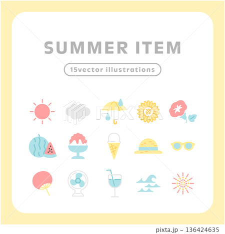夏のアイテム アイコンセット|やさしい配色の夏モチーフ ベクターイラスト