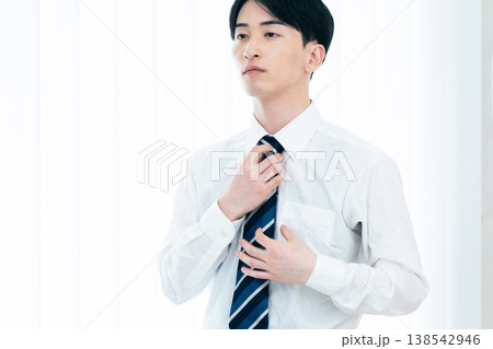 グレーのスーツを着てネクタイを直すミドル男性ビジネスマン