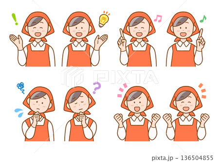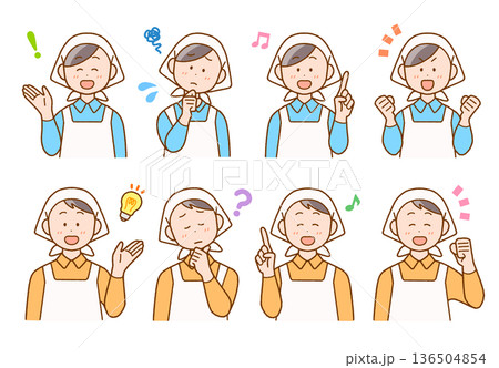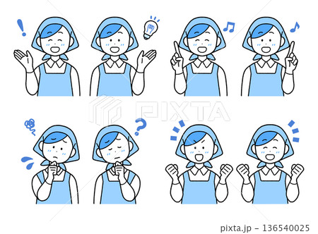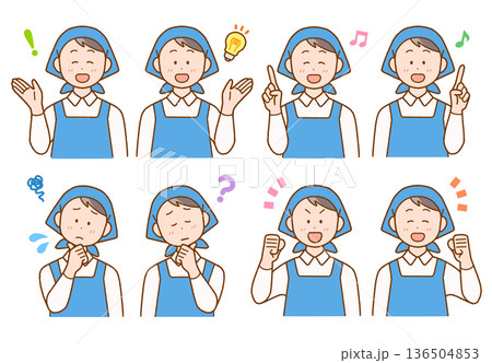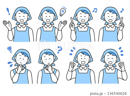 三角巾とエプロンを着用した女性 表情とポーズのバリエーション セット