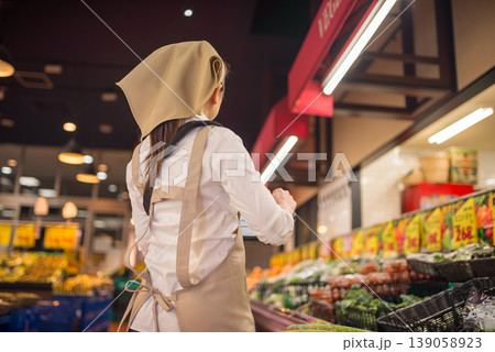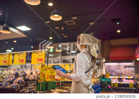 タブレットを持つスーパー店員の後ろ姿