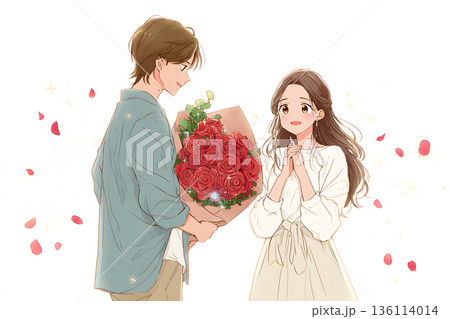 バラの花束の中にダイヤモンドの指輪を贈るプロポーズのロマンチックイラスト
