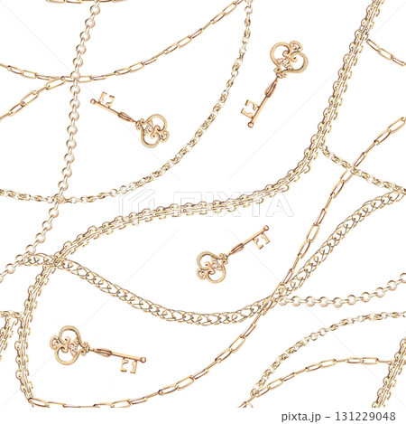 Seamless pattern with gold chains and a key. Isolated watercolor illustration for jewelry packaging design, fabric printing, window dressing, discount coupons, and New Year's cards.