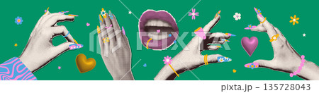 Set of Vivid halftone collage paper stickers of hands with juicy chunky jewelry. Playful Y2K maximalism with bright nails, bracelets, and colorful acrylic rings. Vector. Trendy accessories 90s style