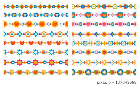 A set of sixteen vibrant, colorful seamless borders featuring geometric and floral patterns with stars, hearts, and beads.