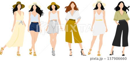 夏のワンピースファッションを着た女性のイラスト素材(3人・全身・おしゃれ・シンプル)