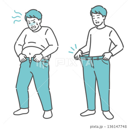 ダイエットに成功してズボンがブカブカになった男性のイラスト(減量・サイズダウン・健康)
