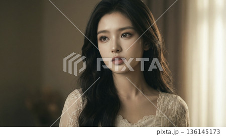 レースのドレスを着て遠くを見つめるクラシックな雰囲気の日本人女性