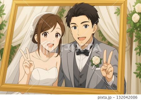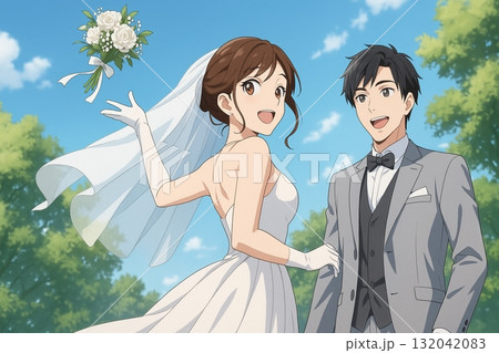 結婚式の新郎新婦のイラスト、ウェディングドレス、洋装