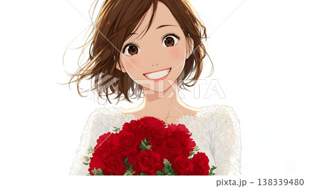 赤いバラのブーケを持ち笑顔で幸せそうに微笑む花嫁のイラスト 結婚式・ジューンブライドのイメージ
