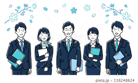 緊張した表情で整列する新入社員の男女グループ