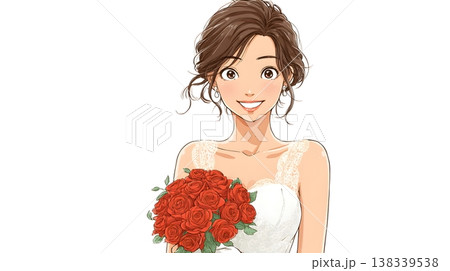 赤いバラのブーケを持つ笑顔のウェディングドレスの女性のイラスト