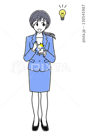 ひらめいて手を打つスーツのOLさん(シンプル・全身)