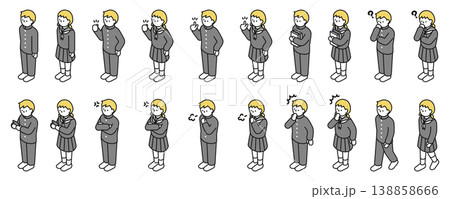 アイソメトリックイラスト:色々なポーズの中学生男女