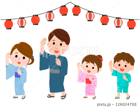 浴衣姿で夏祭りを楽しむ家族4人の手描きイラスト
