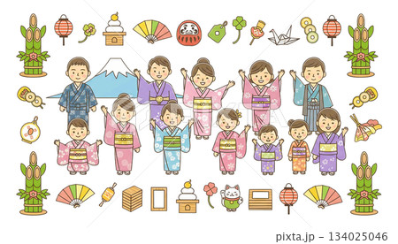 お正月と家族のイラスト_年賀状や和風デザインに_着物を着た人々と縁起物アイコンセット