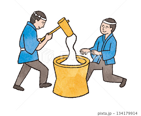 正月の伝統行事・餅つきをする人々のイラスト