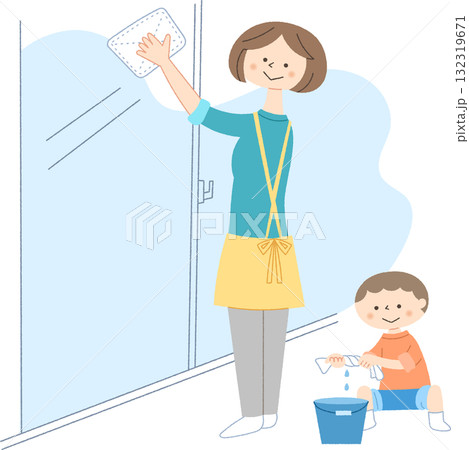 若い家族と掃除道具のフレーム お洒落でかわいい手描き線画イラスト