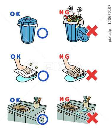 ゴミ箱のふたを閉める 衛生管理 OK NG 比較 イラスト 食中毒予防