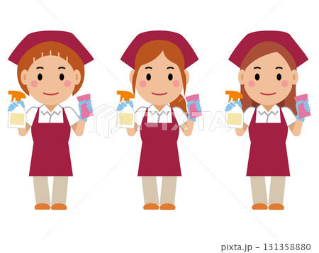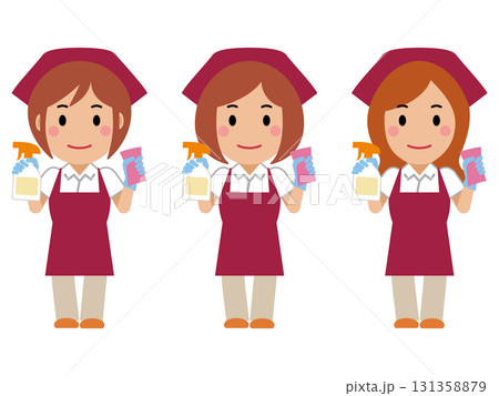 洗剤とスポンジを持つ真紅のエプロンの女性清掃員。その2