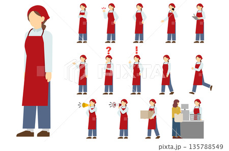 フラットイラスト:赤いエプロンを着たスーパー店員セット
