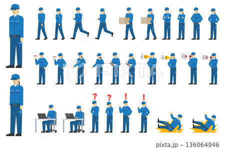 フラットイラスト:青い作業着とキャップを着た作業員セット(表情あり)