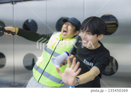 円から飛び出してメガホンで応援する作業員の男女 セット