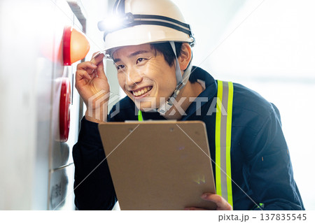 火災報知器の点検をする作業服の男性 ビルメンテナンス イメージ