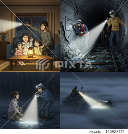 停電した避難所で懐中電灯を照らすリーダー、避難所で避難者を守るスーツ姿の男性、防災現場で指示を出す劇