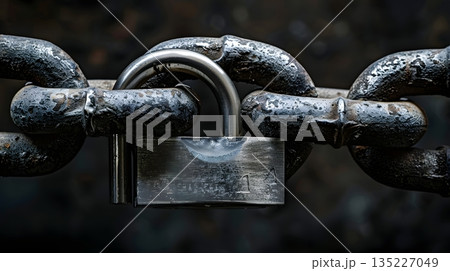 重厚で無骨な錆びついた鉄板に絡み合う古い鋼鉄のチェーン