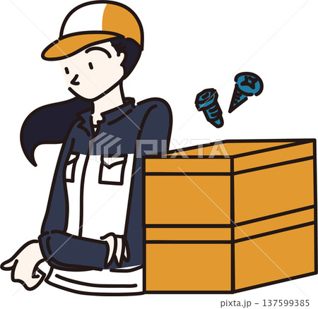 ノギスとねじを持っている作業員の若い男性(全身・正面)