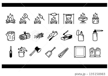 焚火と道具のシンプルなアイコンセット モノクロ